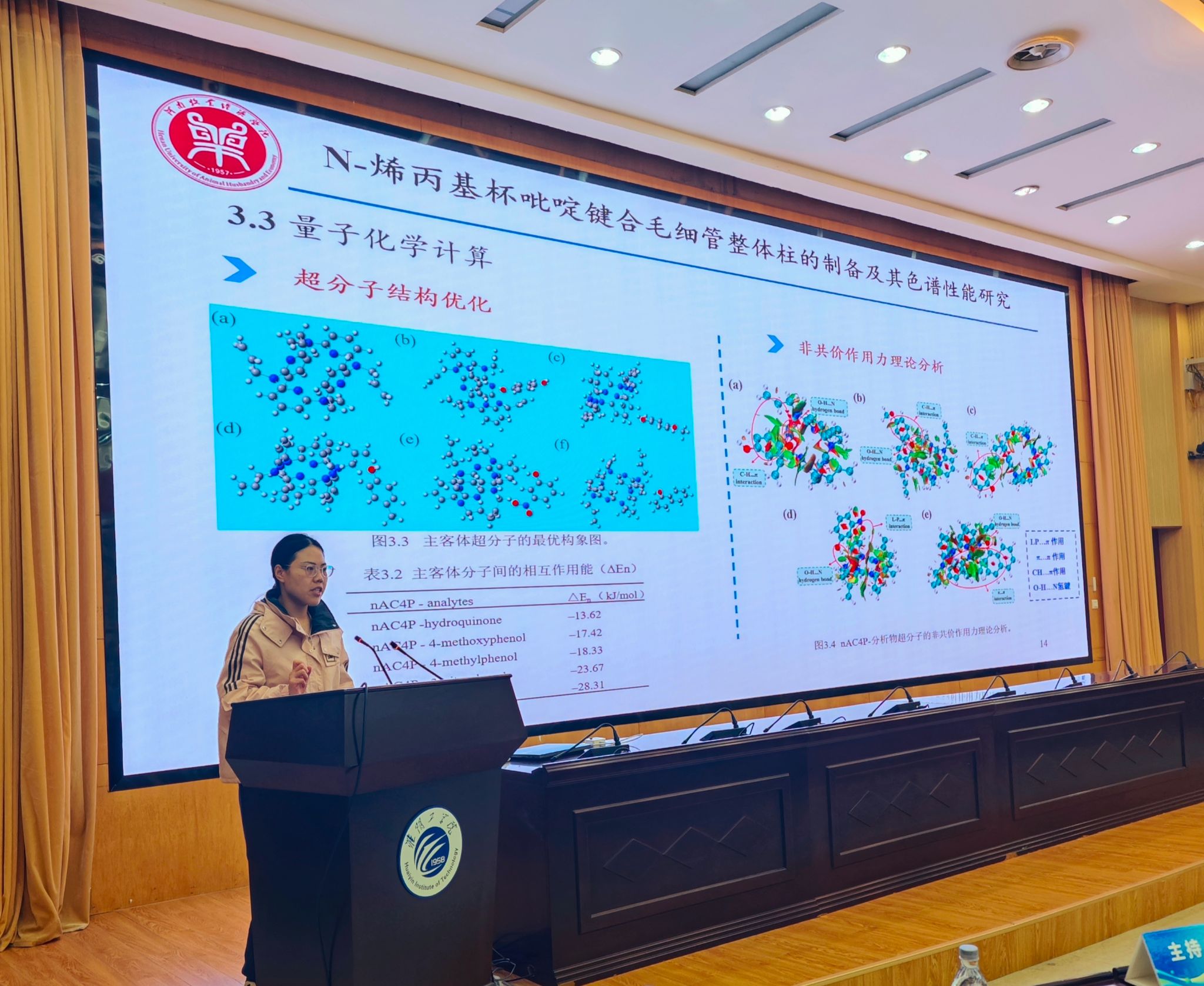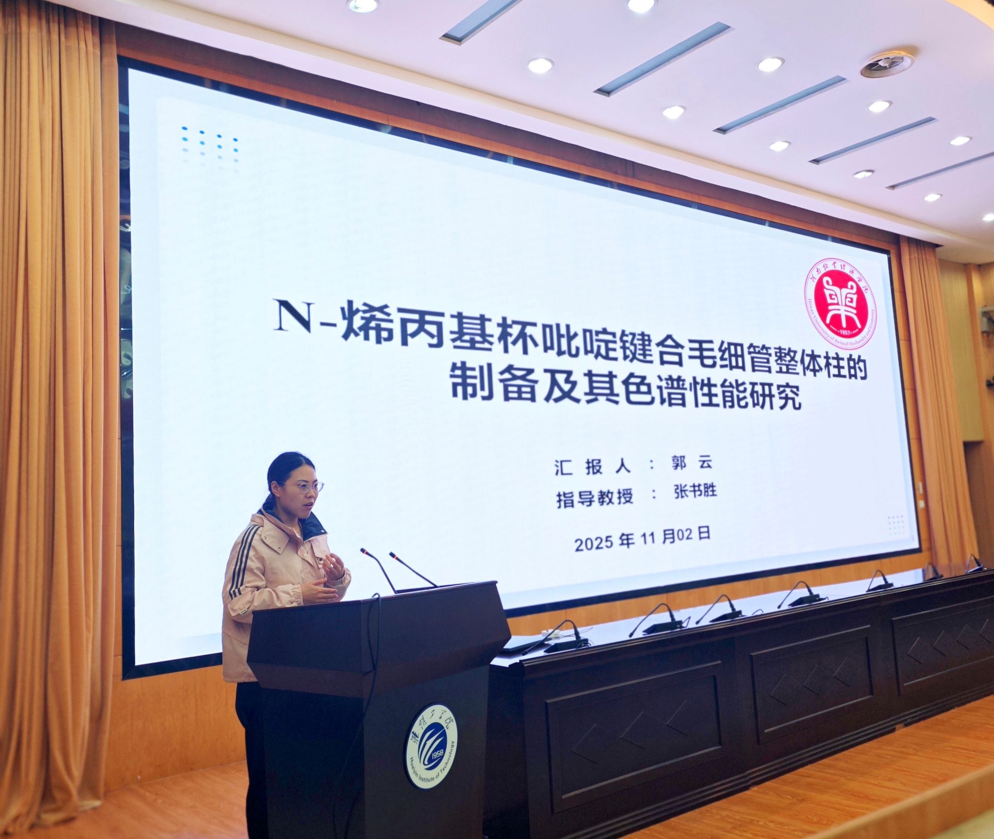 郭云博士以《N-烯丙基杯吡啶键合毛细管整体柱的制备及其色谱性能研究》为题,系统介绍了以N-烯丙基杯吡啶为功能单体,构建新型毛细管整体柱的制备路线、表面形貌调控机制及其在复杂生物样品分离中的优异表现。该研究首次将杯吡啶大环的分子识别特性与烯丙基超交联网络的高稳定性相结合,实现了对双酚类、杂环胺类、生物胺类等九类化合物的高效、快速分离,相关成果已申请国家发明专利2项,充分展示了我校在微尺度分离分析领域的最新进展,受到与会专家的高度评价。